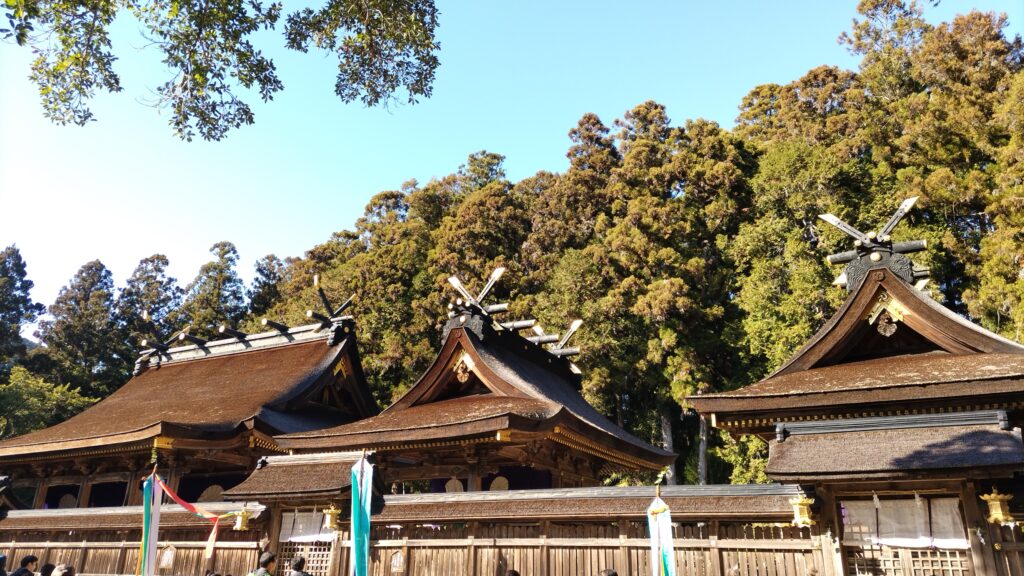 向かって左手の社殿が夫須美大神(ふすみのおおかみ)・速玉大神(はやたまのおおかみ)の両神。中央は主神の家津美御子大神(けつみみこのおおかみ)。そして右手は天照大神(あまてらすおおみかみ)が祀られています。
