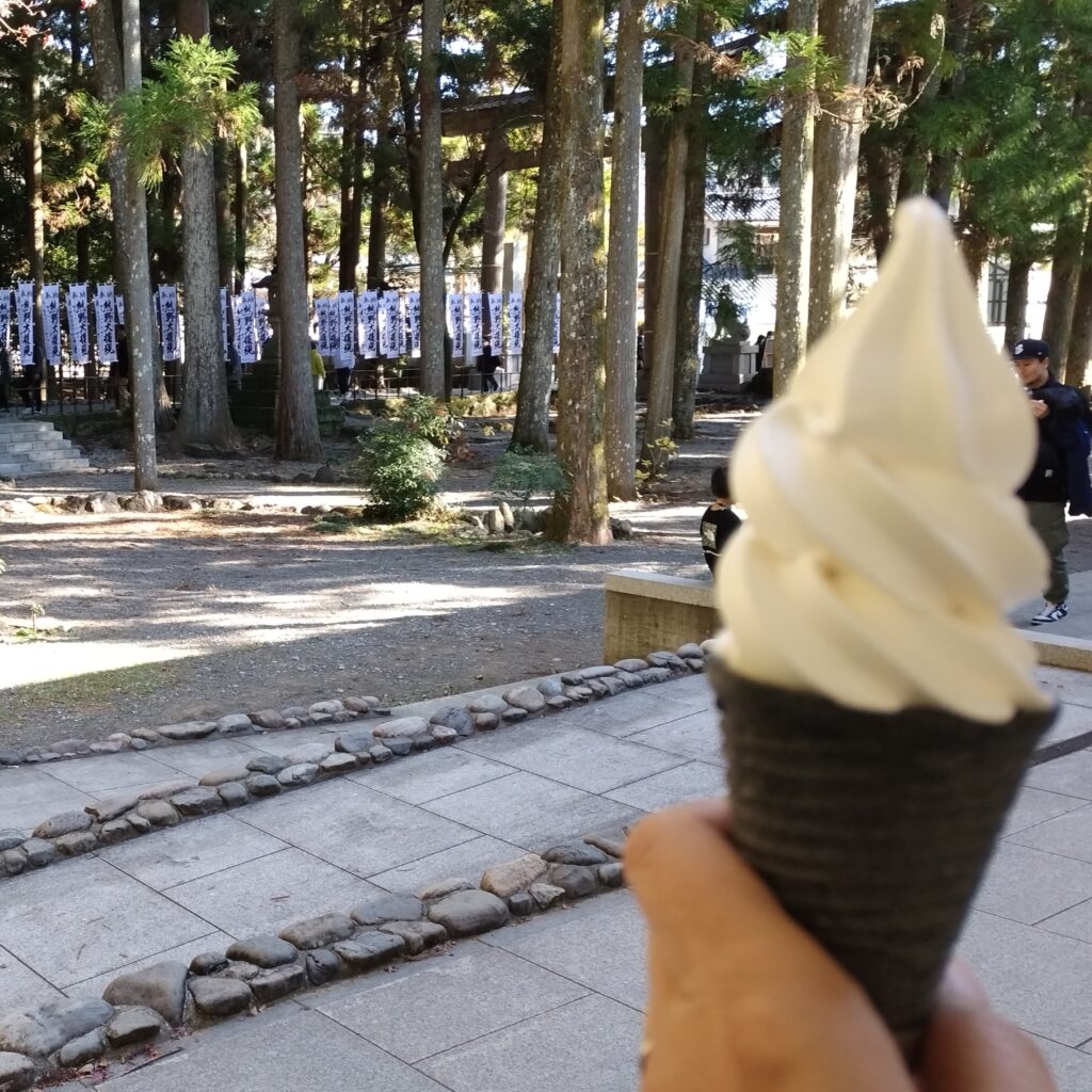 境内にあるcafe almaでは八咫烏のようなコーンが黒褐色のソフトクリームを食べて、「くまみつカステラ」と隣接する名物「おかげ餅」も買って帰りました。どれも美味しかった。
