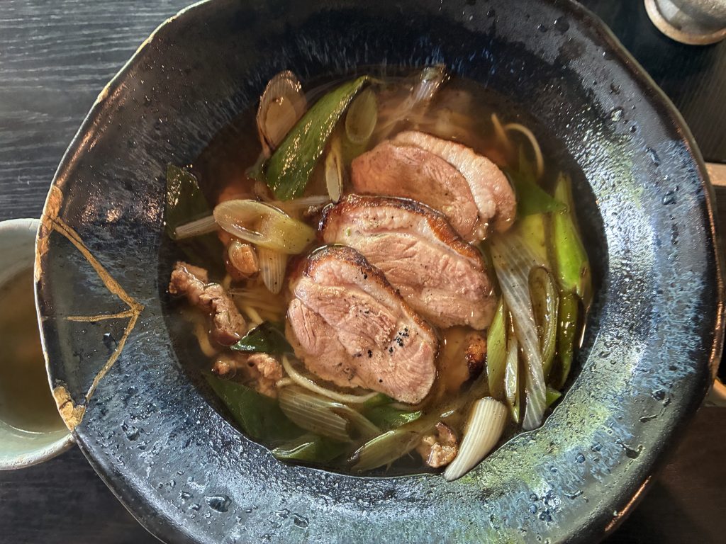 丹波裁ち切りそばと出汁、河内鴨からしみ出る濃厚、且つクリアな旨味油、地元産の薬味葱とのコンビネーションが丹波焼の器の中で絶妙な一杯を織りなします。